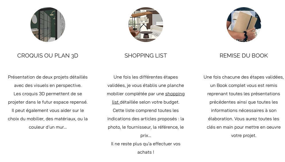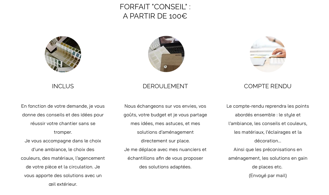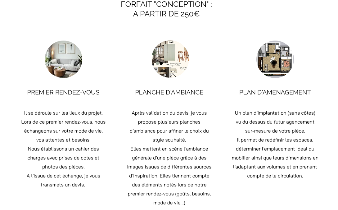 Chaque projet étant unique, le tarif peut donc varier en fonction des besoins . Pour vous accompagner dans l’élaboration de votre projet d’aménagement ou de décoration, je vous propose un suivi de nos échanges en plusieurs étapes selon vos besoins et attentes, et vous formule plusieurs propositions à travers un book déco.